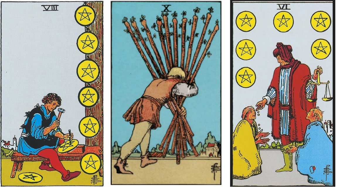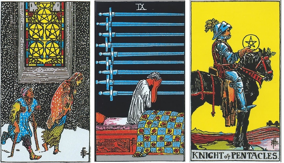 - 펜타클 5: 현재 경제적으로 궁핍하거나, 자금 부족의 스트레스를 받는 시기예요.