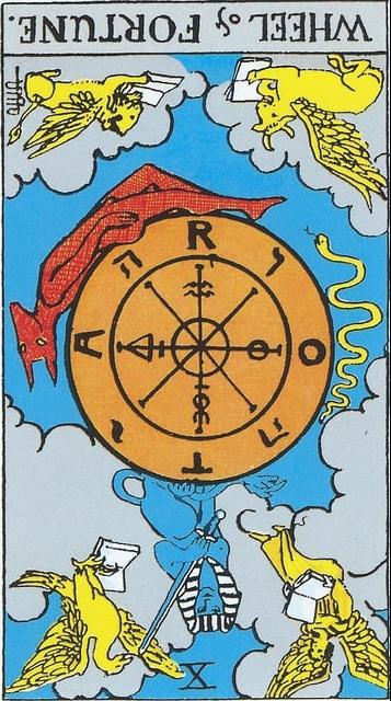 카드의 중심에는 거대한 황금색 수레바퀴가 있습니다. 바퀴에는 히브리어 글자와 TARO 혹은 ROTA(바퀴)를 뜻하는 철자가 새겨져 있으며, 그 위에는 다양한 상징체가 얽혀 있어요. 수레바퀴 위에는 스핑크스가 앉아 있고, 오른쪽에는 하강하는 뱀(세트), 왼쪽에는 오르려는 아누비스가 그려져 있습니다.