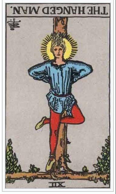 이 카드에는 한 남자가 나무에 거꾸로 매달려 있습니다. 그는 한쪽 다리를 십자 모양으로 교차하고 있으며, 머리 위에는 빛나는 후광이 떠 있죠. 이 후광은 깨달음을 의미합니다.