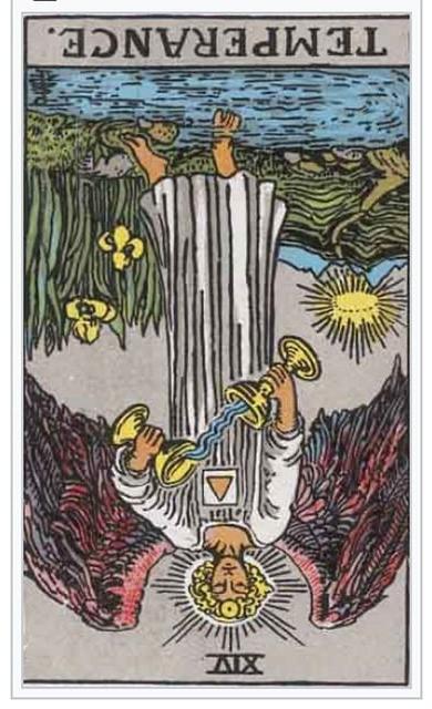 유니버셜 웨이트 타로의 절제 카드는 한 천사가 두 개의 잔 사이로 물을 옮기고 있는 모습을 보여줍니다. 이 천사는 한 발은 물속, 한 발은 육지에 디디고 있고, 뒤에는 황금빛 왕관이 있는 길이 펼쳐져 있습니다.