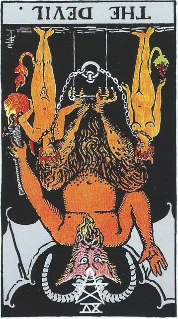 유니버셜 웨이트 타로에서 악마 카드는 매우 강렬한 인상을 줍니다. 염소 머리에 박쥐 날개를 가진 악마가 연단 위에 앉아 있고, 그 앞에는 사슬에 묶인 남녀 한 쌍이 서 있습니다. 악마의 손은 위로 들어 올려져 있고, 손바닥에는 거꾸로 된 오각성이 그려져 있어요.