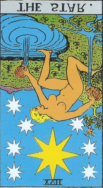 이 카드는 굉장히 평화롭고 안정된 분위기를 자아내요. 한 여인이 물병 두 개를 들고 한쪽은 호수에, 다른 쪽은 땅 위로 물을 붓고 있고, 그녀 뒤로는 별들이 밝게 빛나고 있어요.