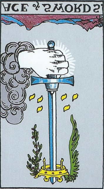 검 끝에는 왕관이 씌워져 있고, 월계수 잎이 감싸고 있어요. 이는 승리, 권위, 진실을 향한 통찰의 상징이에요.