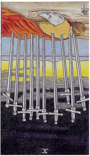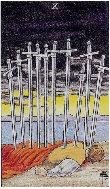 등에 10개의 검이 꽂힌 인물: 이미 끝장이 난 상황이에요. 이 인물은 완전히 쓰러져 있고, 더 이상 움직일 수 없는 상태. 이는 극단적인 고통이나 배신, 돌이킬 수 없는 실패를 상징해요.