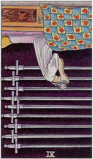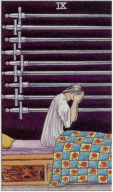 벽에 걸린 9개의 검: 위협적으로 늘어선 검들은 끊이지 않는 생각, 걱정, 자책, 고통스러운 기억을 의미해요. 정신이 쉴 틈 없이 괴롭고 무거운 상태예요.