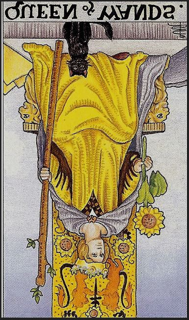 - 왕좌에 앉아 완드를 든 여왕: 그녀는 침착하고 자신감 있는 자세로 완드를 쥐고 있어요. 이는 자신의 열정과 창의력을 능숙하게 다루는 사람을 상징합니다. 불의 성향을 실용적이고 균형감 있게 활용하는 모습이죠.