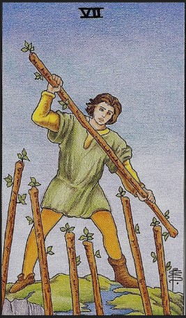 완드 7 (Seven of Wands) – 방어, 도전, 우위에서의 싸움